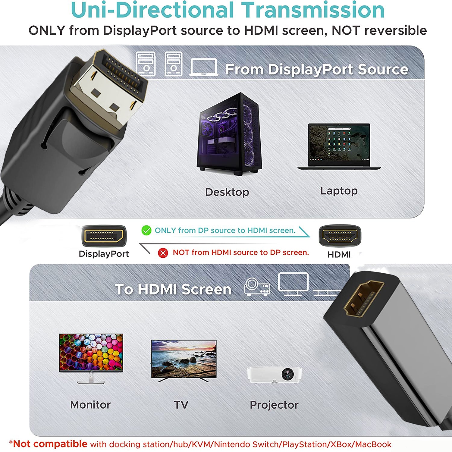 - his DisplayPort to HDMI Cable is compatible with laptop, desktop tower, graphic card (AMD, NVIDIA), TV, Monitor, Projector and other devices.